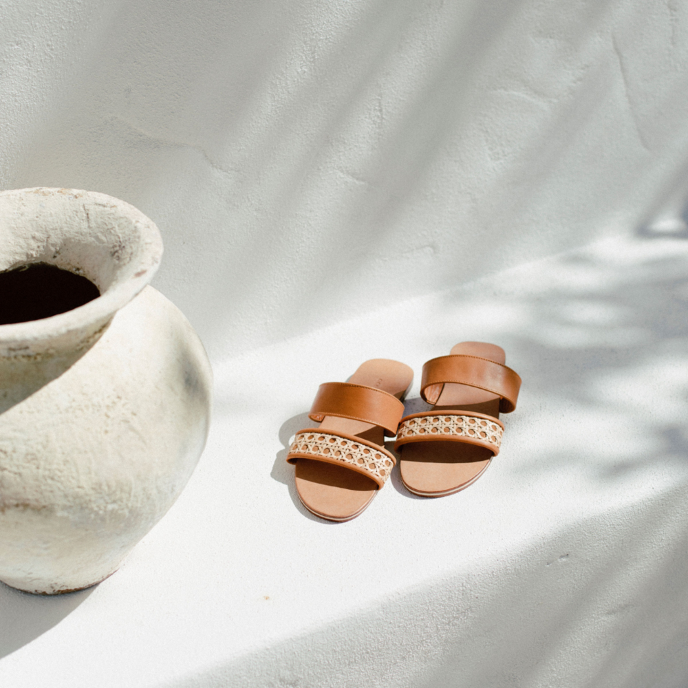 Heather Leather and Rattan Slides
